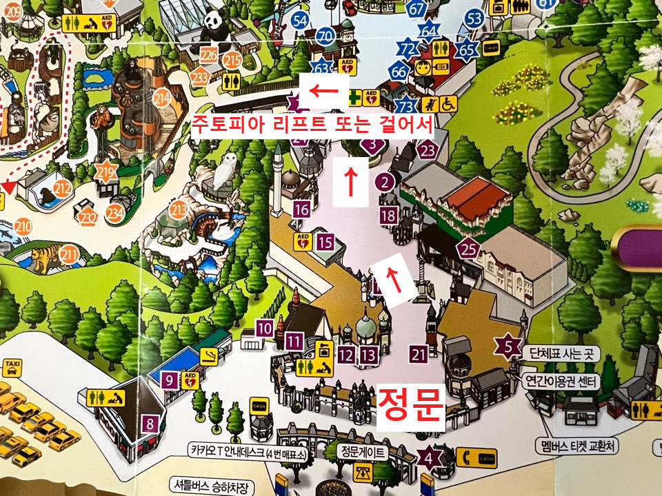 1. 먼저 도착하셔서 정문으로 들어와 간단히 사진 찍고, 왼쪽에 지도상 7번 (휴번 스카이) 리프트를 이용해 주토피아로 내려갑니다.