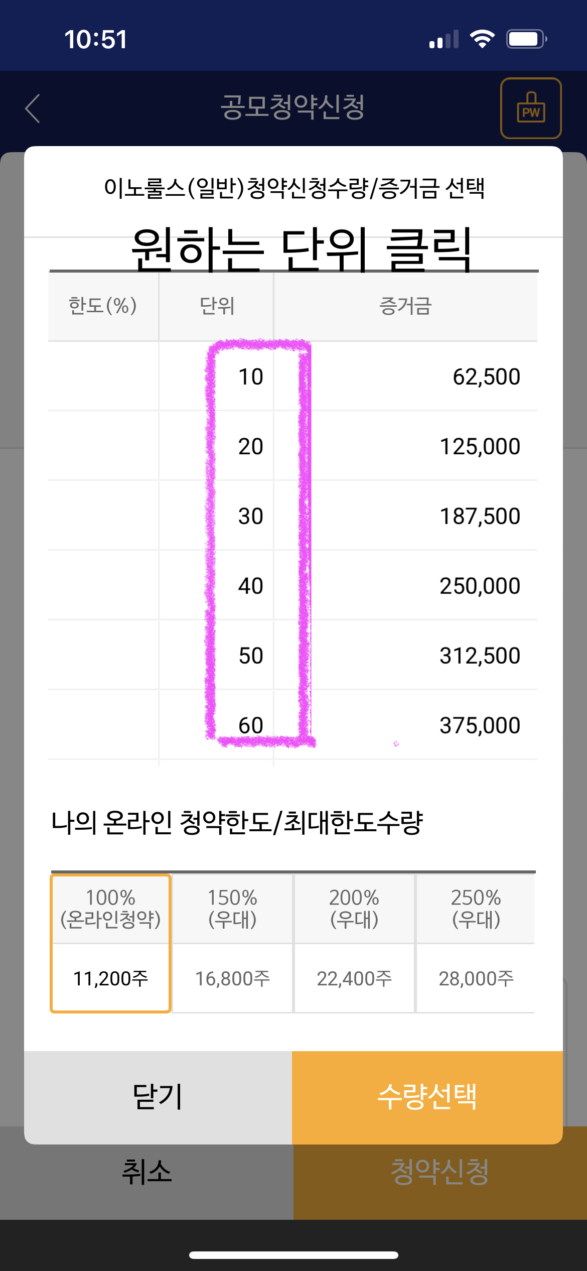 4. 원하는 주수를 클릭합니다. 단위=주수 입니다. 저는 균등 배정만 노려서 10 클릭했습니다. ▼