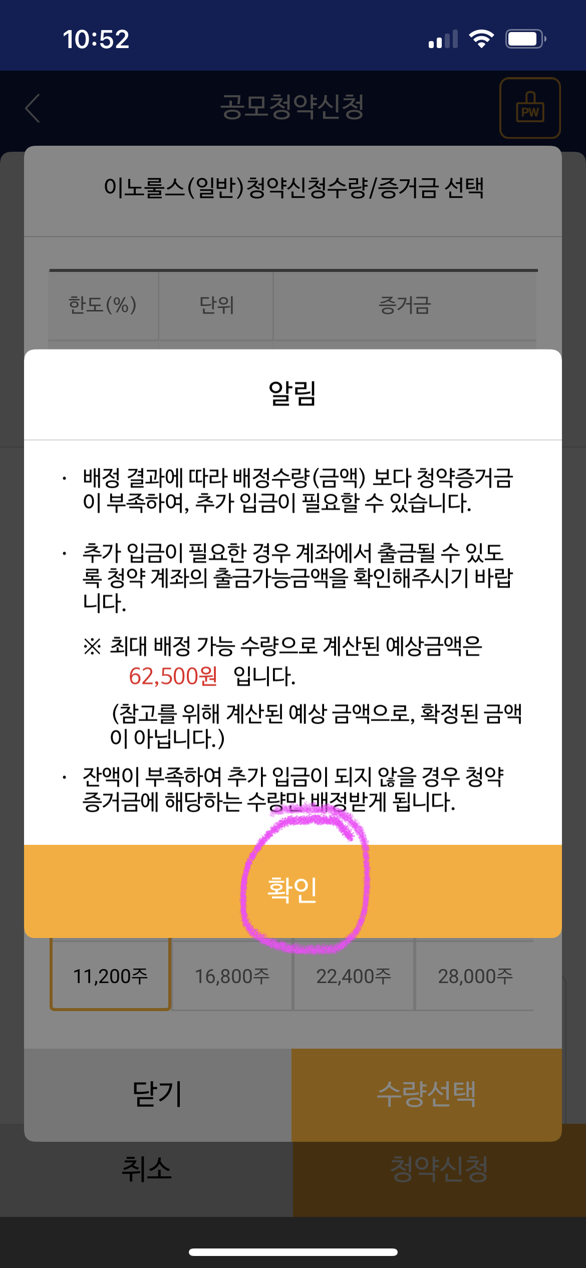 11. 저와 같이 아래와 같은 화면에서 청약 주수를 확인 하시고 맞다면 청약 절차가 완료됩니다. 만약에 잘못하셨다면 청약 취소를 누르시고 다시 하실 수 있습니다. ▼