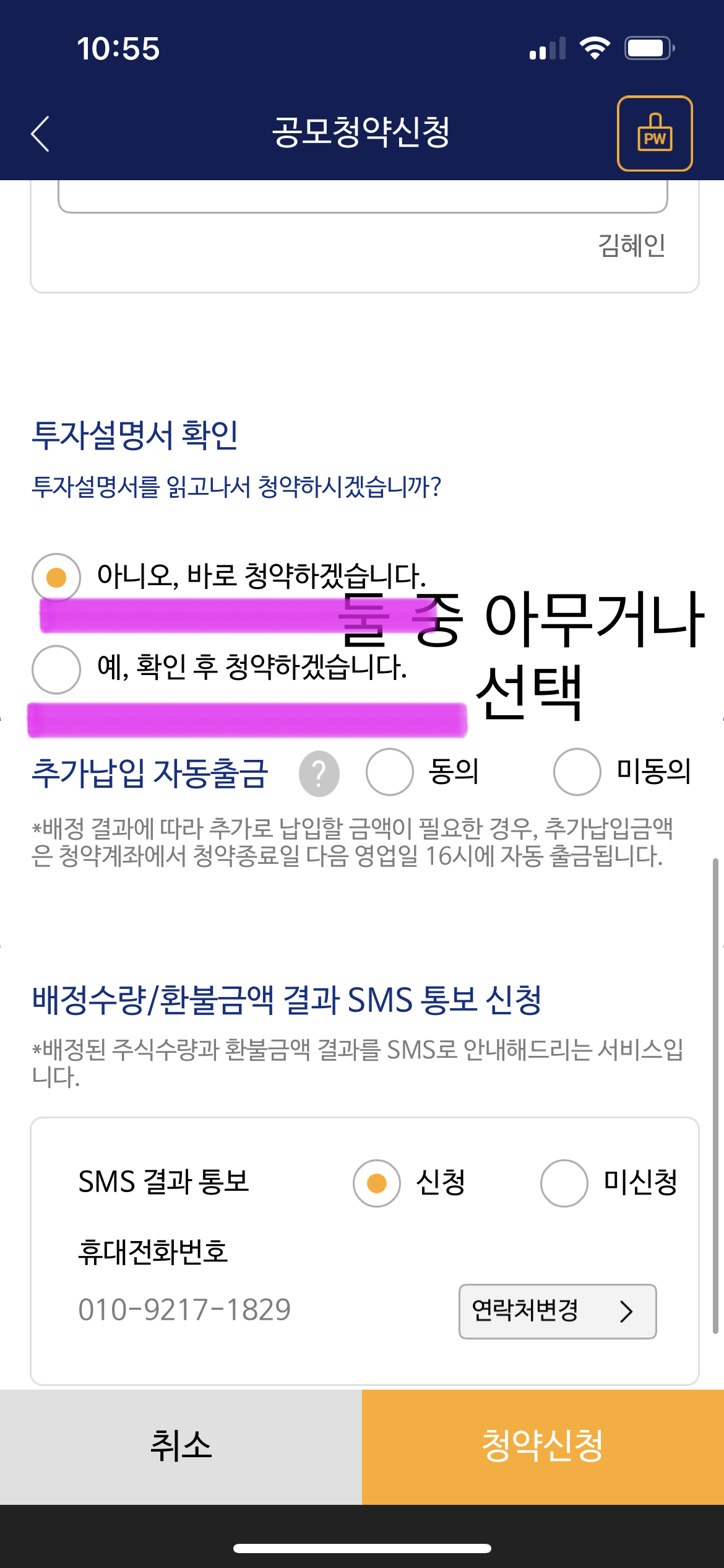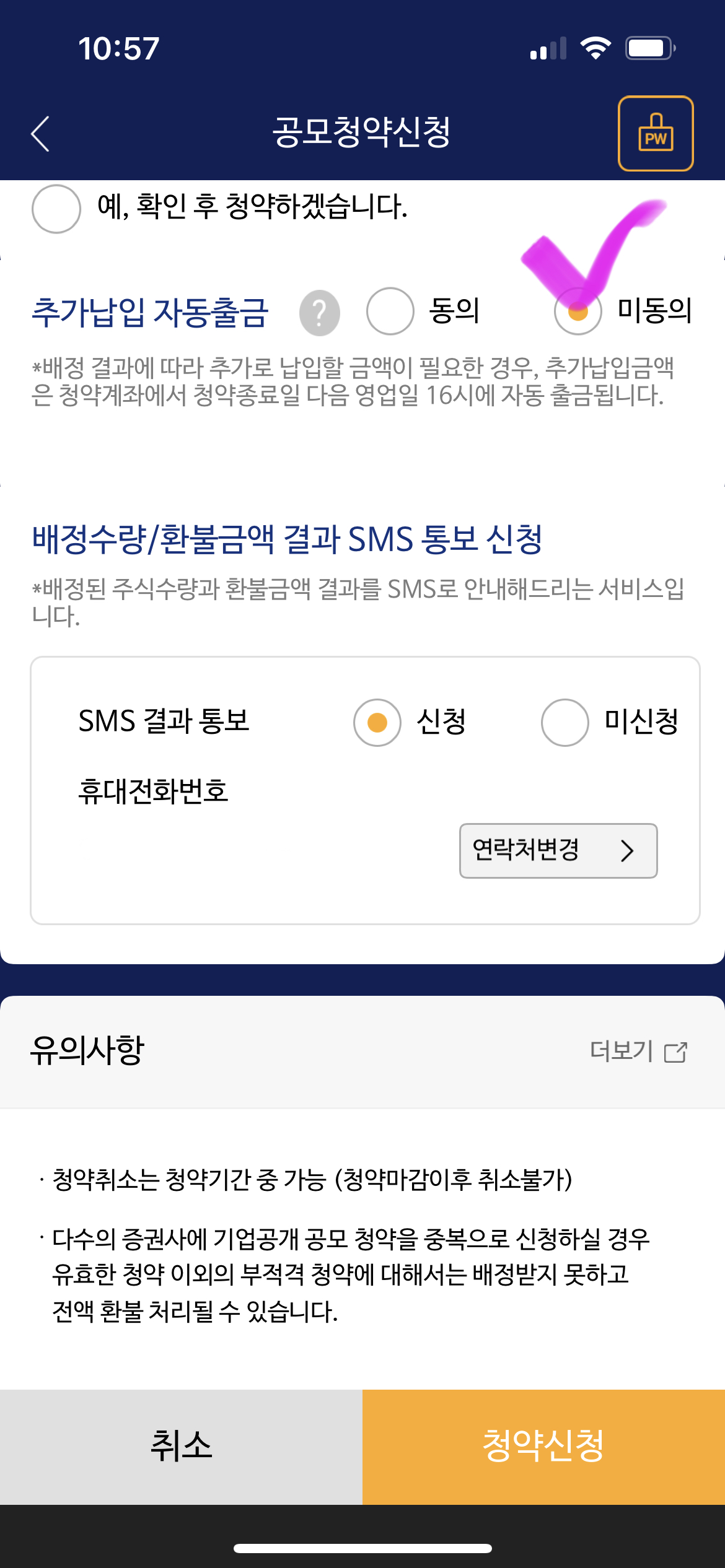 9. 추가납입 자동출금은 보통 미동의를 선택하시는 것이 안전합니다. 동의하셔도 균등 청약에선 출금이 될 일은 거의 없다고 보시면 됩니다. >>그 다음 완료를 위해 맨 아래 청약 신청을 눌러주시고 혹시 본인 인증을 하라고 하면 인증 비밀번호를 눌러주세요. ▼