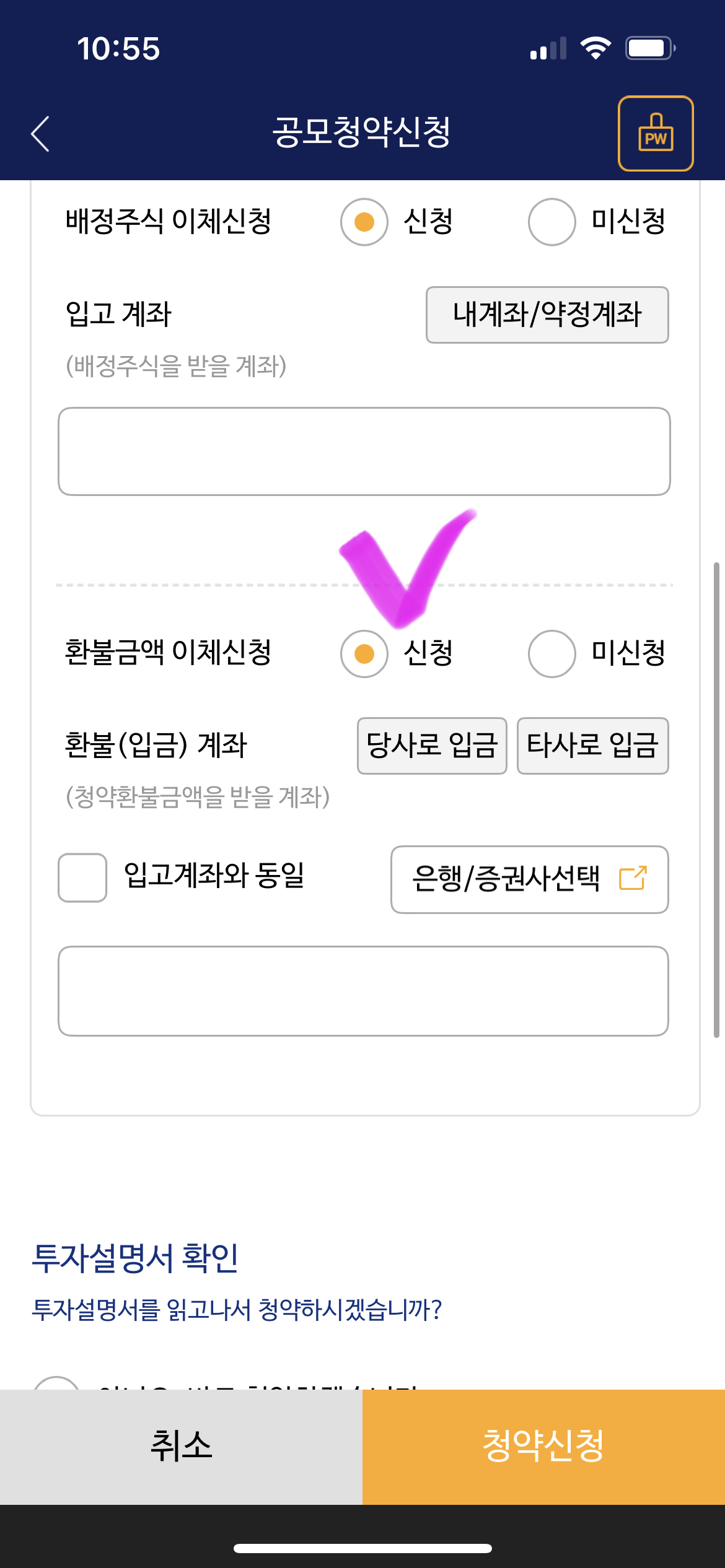 8. 계좌 선택을 모두 하셨으면 투자 설명서란을 확인하셔야 하는데 설명서를 보고 싶으시면, 확인 후 청약하겠습니다를 골라주시고, 사실 둘 중 아무거나 상관은 없습니다. 저는 번거로워서 아니 오를 선택 합니다. ▼