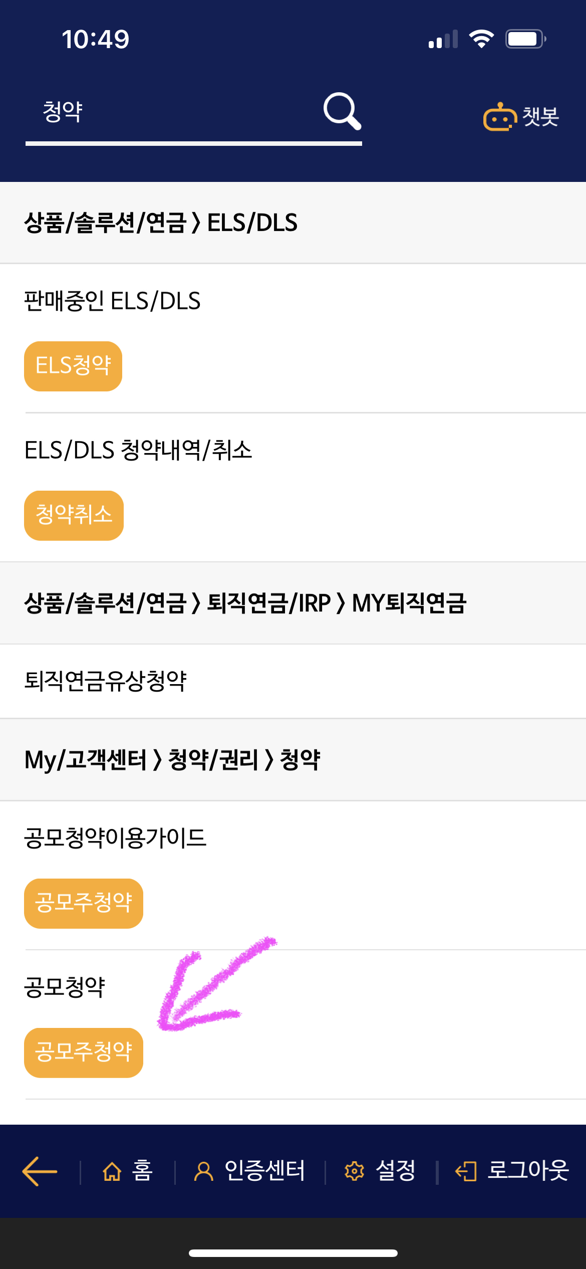 1. 먼저 메뉴 검색을 이용해 '청약'을 입력하고 <공모주 청약>이라는 노란색 메뉴를 선택합니다. ▼