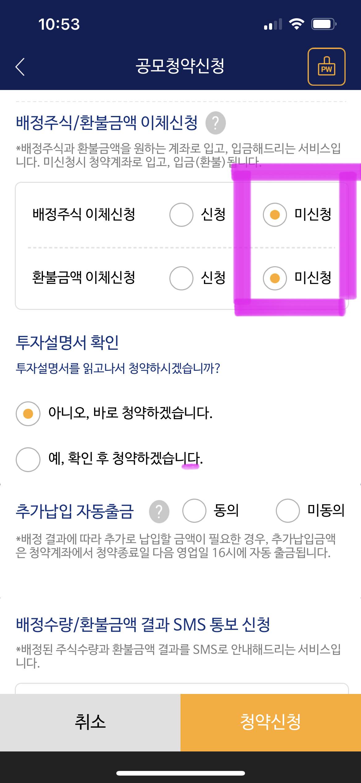 7. 아까 말씀드린 주식 입고 계좌와 환불 계좌를 선택하는 란입니다. 미신청으로 둘 다 해놓은 시면 자동으로 현재 NH투자증권으로 입고가 되고 환불이 됩니다. ▼
