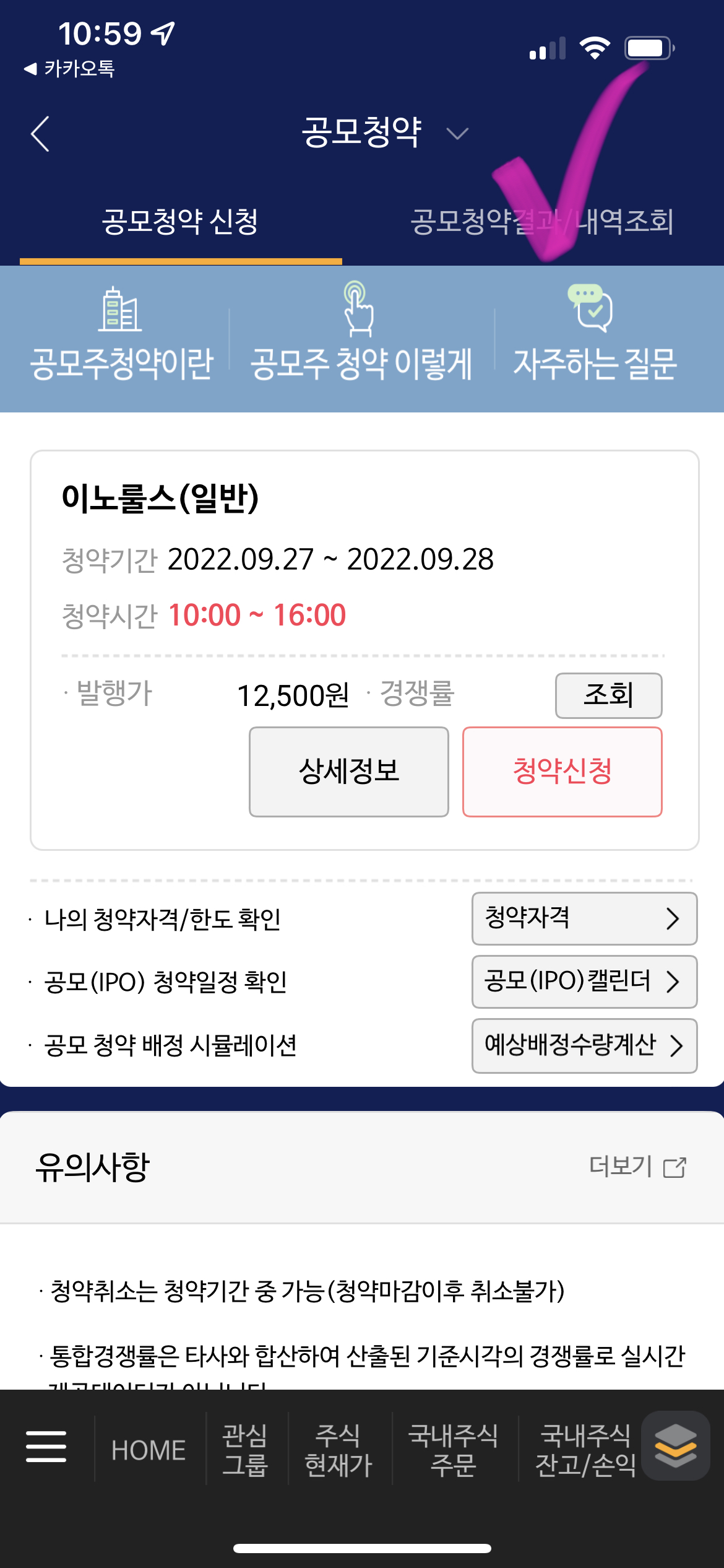 2. 그러면 현재 청약 가능한 공모주들이 뜨는데 이노룰스가 바로 뜨죠? 그러면 청약 신청을 클릭합니다. ▼